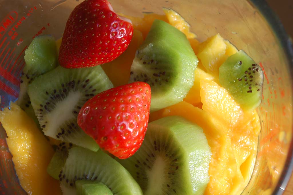 Do wyboru zmiksować razem , moja ulubiona mieszanka to kiwi, sok z grejpfruta, sok z cytryny, mango, dodać niewielką ilość zimnej wody.